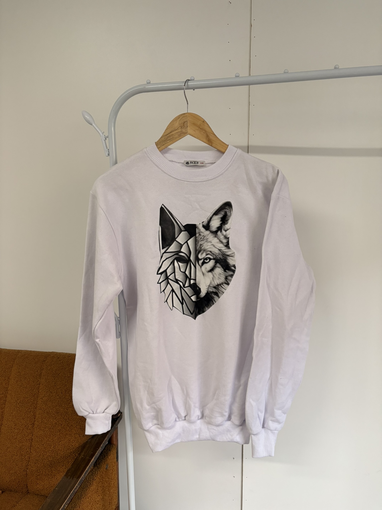 Bluze e bardhë me print ujk në stil gjysmë realist, gjysmë gjeometrik.