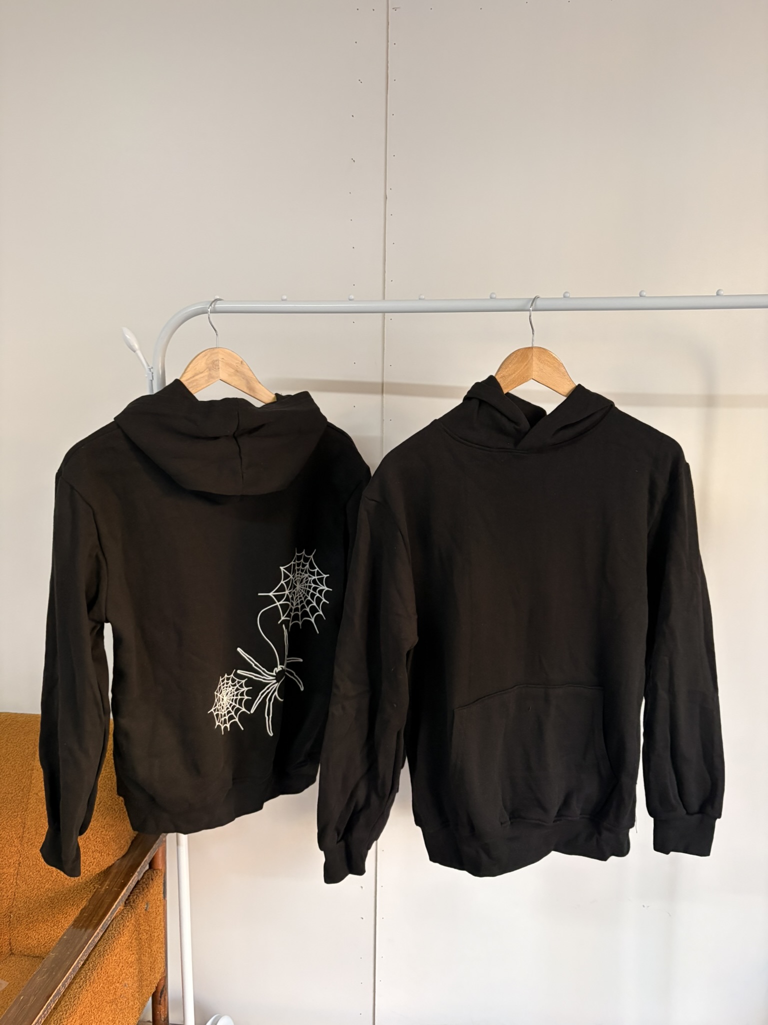 Hoodie i zi me print merimange dhe rrjetë në pjesën e pasme.
